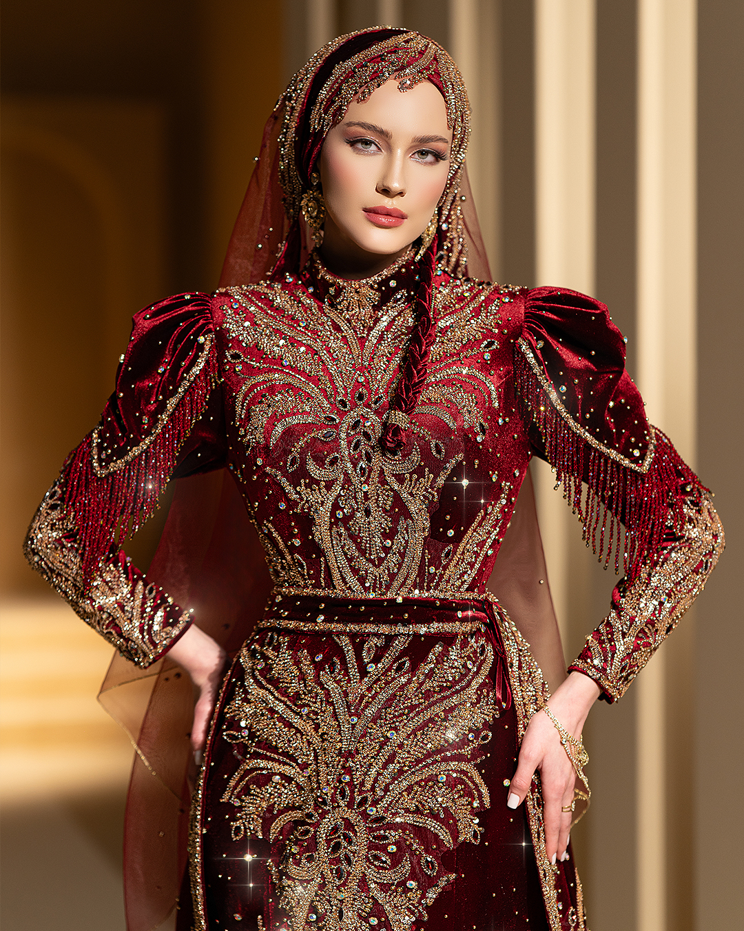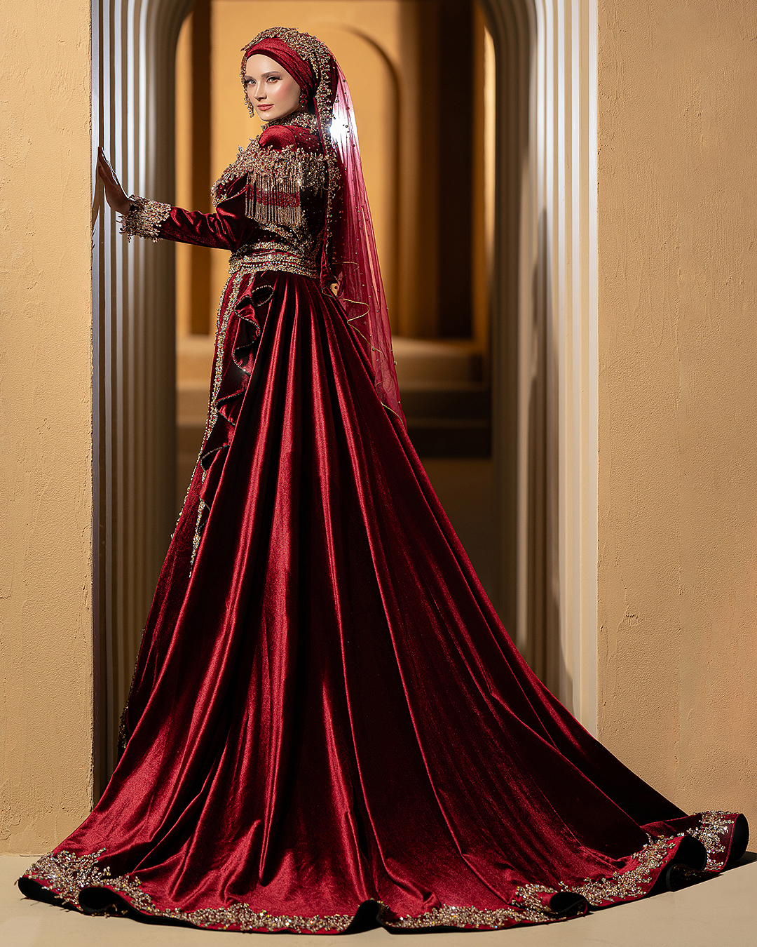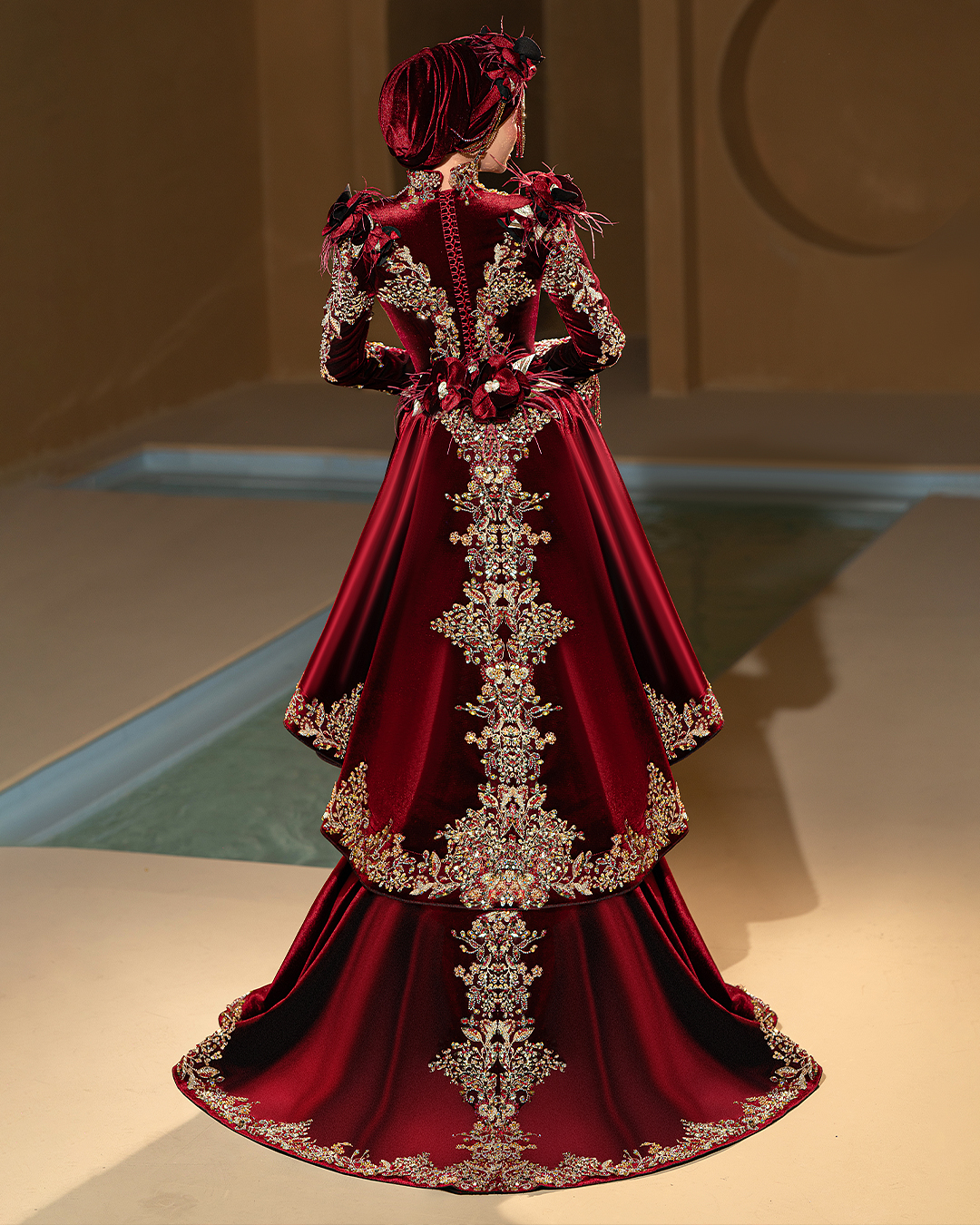Zengin bordo kadife dokusuyla ihtişamı temsil eden 8016 modelimiz, geleneksel motifleri modern bir zarafetle buluşturuyor. Altın tonlarında işlenen el emeği boncuk ve taş detayları, omuzdan kuyruk ucuna kadar adeta bir taç gibi gelin adayını süslüyor. Gösterişli püskül aplikler, tarihi saraylardan ilham alınarak tasarlanmış görkemli bir duruş sunarken, bele oturan formuyla asil bir siluet yaratıyor.