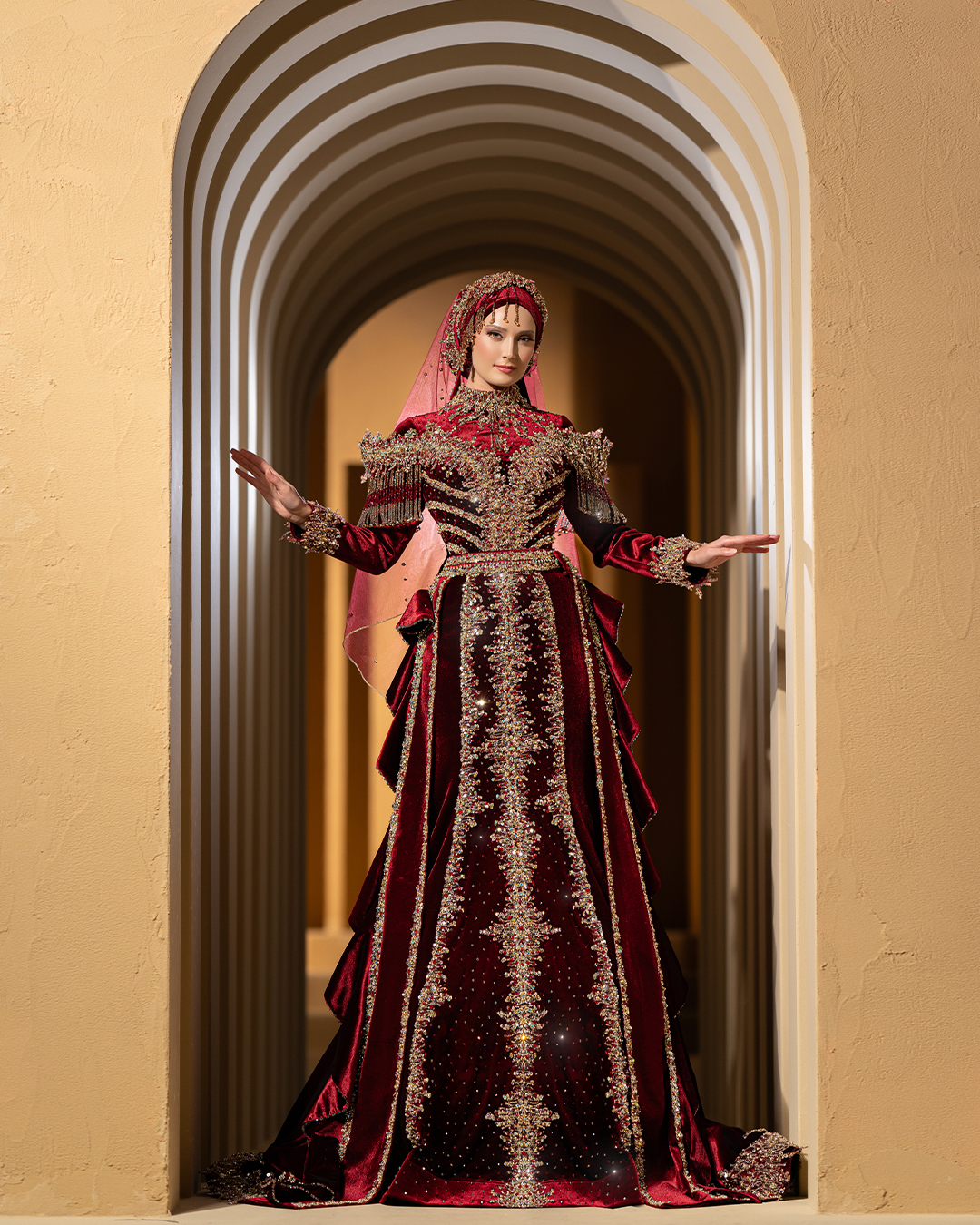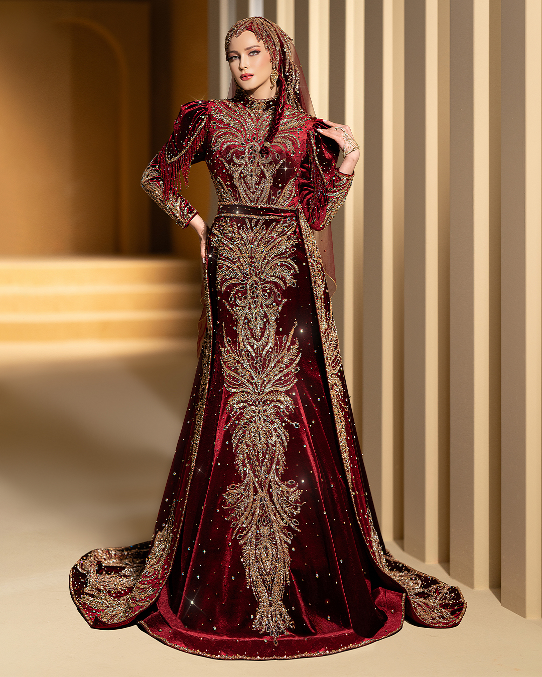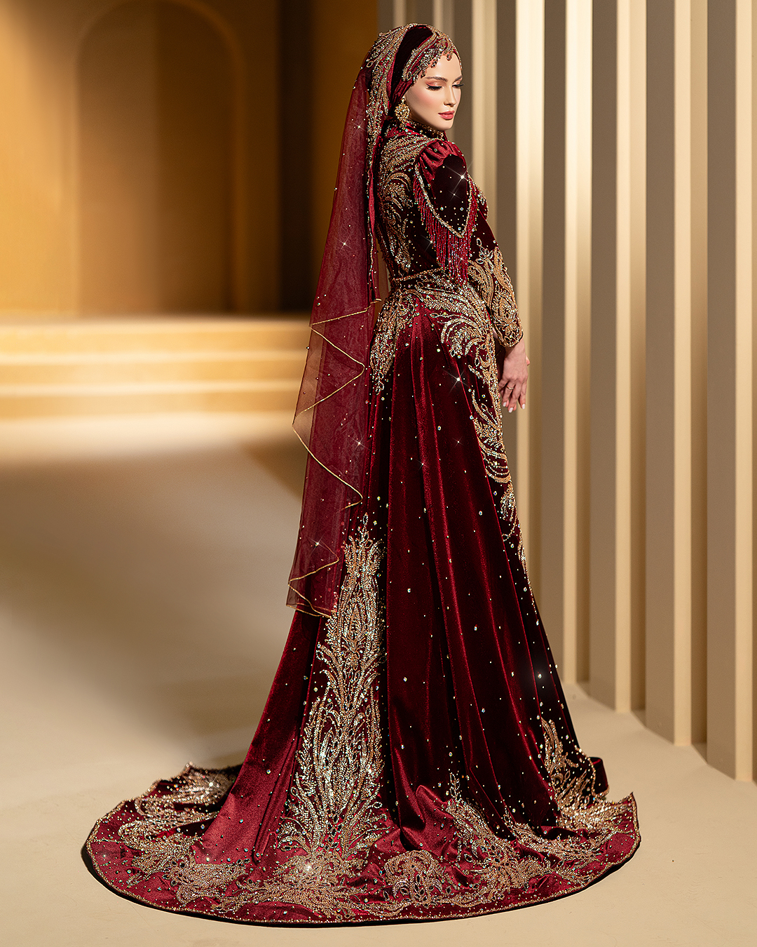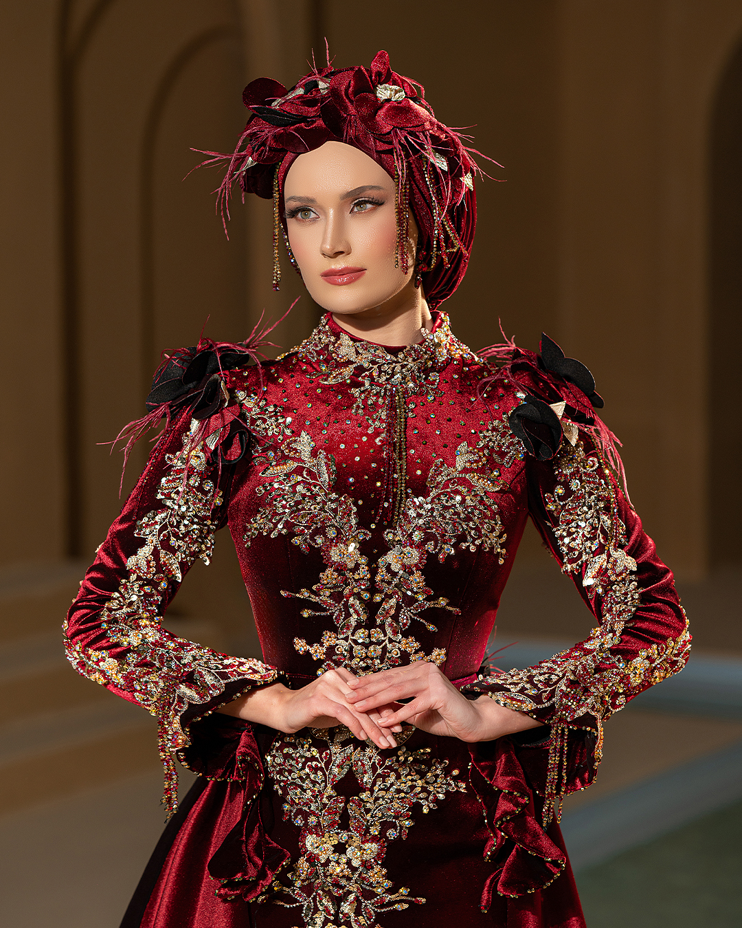 Zengin bordo kadife dokusuyla ihtişamı temsil eden 8016 modelimiz, geleneksel motifleri modern bir zarafetle buluşturuyor. Altın tonlarında işlenen el emeği boncuk ve taş detayları, omuzdan kuyruk ucuna kadar adeta bir taç gibi gelin adayını süslüyor. Gösterişli püskül aplikler, tarihi saraylardan ilham alınarak tasarlanmış görkemli bir duruş sunarken, bele oturan formuyla asil bir siluet yaratıyor.